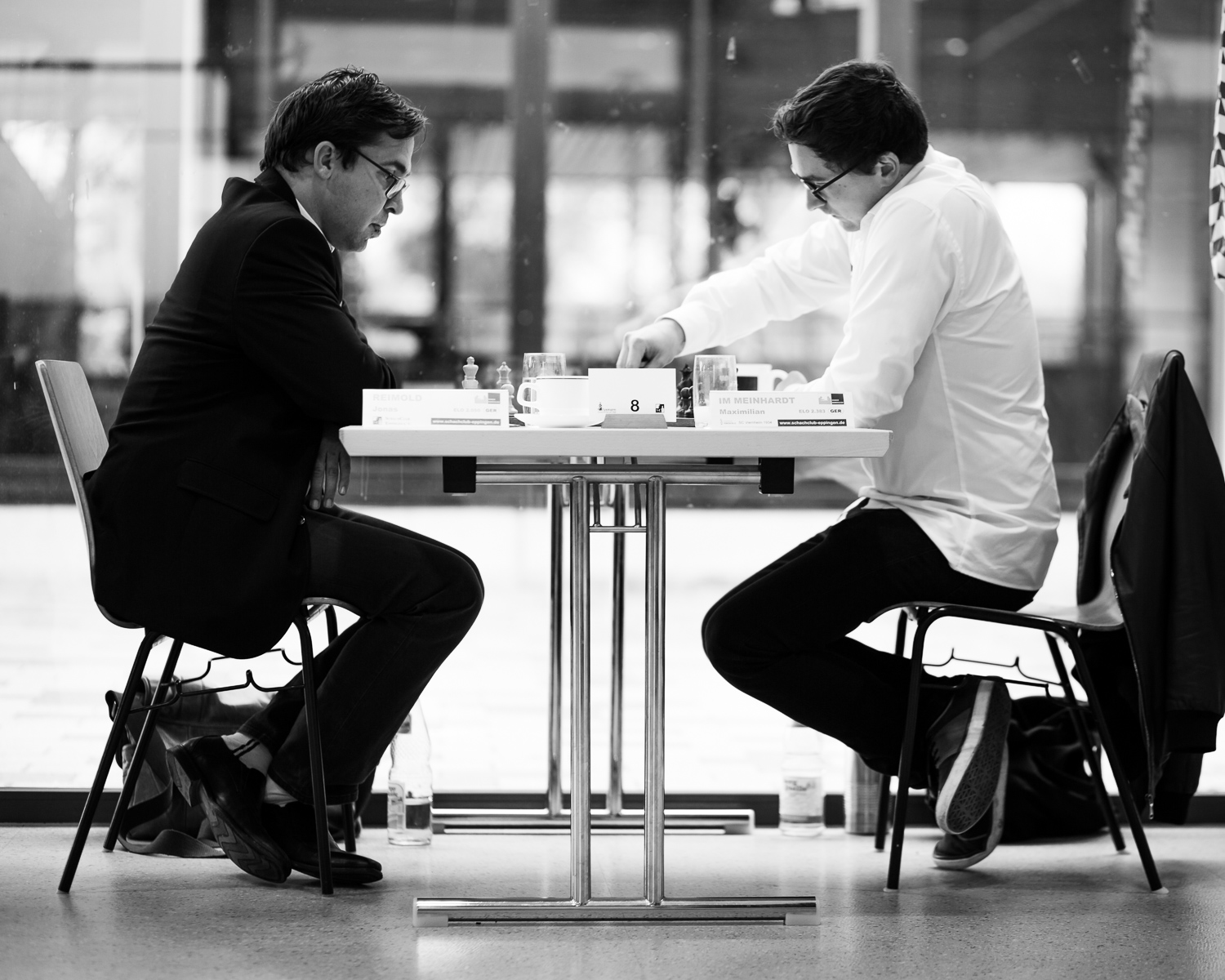 Für den Sonntag hatte Jonas Reimold noch ein Ass im Ärmel. IM Dennis Breder, der ursprünglich abgesagt hatte, reiste für das äußerst wichtige Mörlenbach-Spiel doch noch aus Konstanz an und verwaltete das Spitzenbrett. Trotz der Prognose (4,74:3,26 für Eppingen) fing es schlecht an. IM Christopher Noe (2) verlor seine Partie und FM Anton Bilchinski (6) remisierte. Zur Zeitkontrolle also 0,5:1,5 gegen Eppingen. Aber kurze Zeit danach brach der Mörlenbacher Widerstand zusammen. IM Florian Mesaros (3), FM Jonas Hacker (5) und Emran Hamid (8) verwerteten ihre Vorteile gekonnt zum Gewinn und der Sieg von FM Danijel Gibicar (7) sorgte für das uneinholbare 4,5:1,5 für Eppingen, das GM Zoltan Medvegy (4) mit seinem Sieg noch ausbaute. Da war die Niederlage von IM Dennis Breder (1) in Zeitnot nicht mehr als ein kleiner Wermutstropfen im Freudenbecher des 5,5:2,5-Erfolges. Parallel überspielte Viernheim das überforderte Untergrombach mit 6,5:1,5.